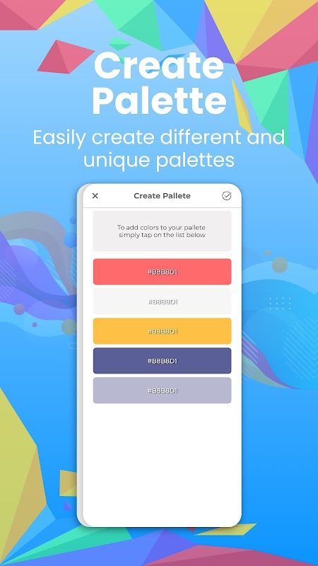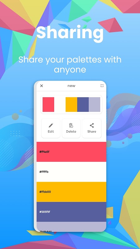 輕鬆保存、共享、刪除和編輯以前保存的調色板。該應用程序包含最流行的顏色模型,包括 RGB、HEX、HSV 等。