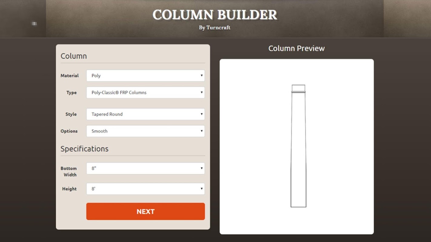 Choose your construction material (Wood or Poly), Style, Type (Round, Tapered Round, Square, etc), Options (Smooth or Fluted). Check the preview to see how your choices affect the final product. Select a base diameter and height. Want caps and/or bases? Choose from what is available. Choose from dozens of plan shapes like full-round, 3/4-round, 1/2-round, 1/4-round or wrap-around.