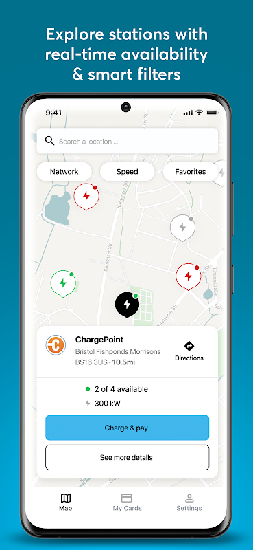 • 在您首選的導航應用程式中取得充電地點的逐步指示