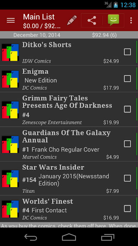 再也不會錯過您喜愛的漫畫的發行,您將知道它們在商店中到期的確切日期。再也不會懷疑您是否購買了該期雜誌或其他版本的封面,除非您將其選中,否則它就在購物清單中。