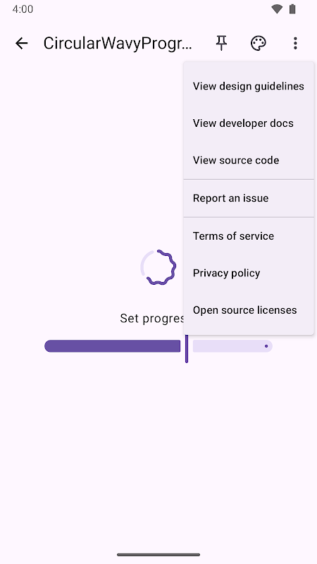 Material Design 組件、主題、深色主題以及如何在 Jetpack Compose 中實現這些功能的規範參考:Compose 材料目錄。該目錄由三個主要屏幕組成:主屏幕、組件屏幕和示例屏幕。您可以隨時從頂部應用欄中啟動主題選擇器或“更多”菜單。該應用程序還支持深色主題。
