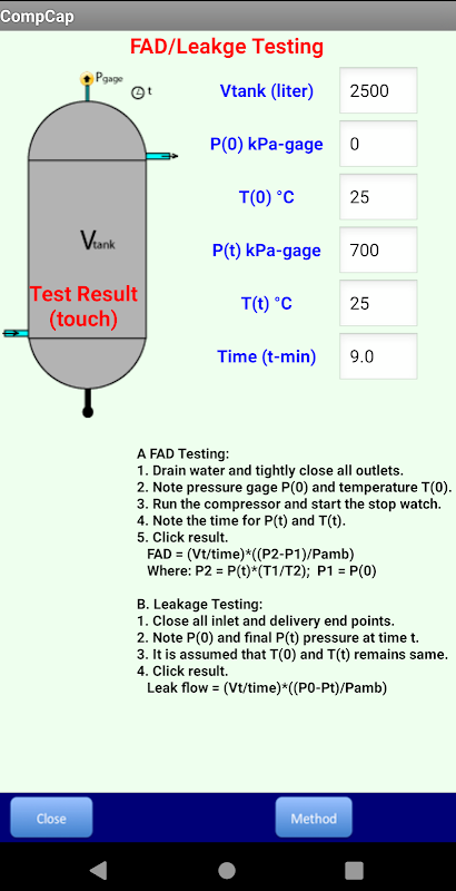 製造商給予一定的標準作業條件的的FAD,電力和其他效率壓縮機的規格等數據。但是,壓縮機的正常工作兩個設定壓力點之間,用於裝載和卸載。因此,應用程序使用一個假設的平均排放壓力環境壓力比,計算出不同的性能指標。此外,任何在運行條件,例如,由於大氣壓力的高度,溫度,濕度等的變化也可能對壓縮機的性能有相當大的影響。一個典型的例子是顯示在屏幕快照。因此,應用程序可以是一個有用的工具,不同的操作和維修人員不時壓縮機性能評價。