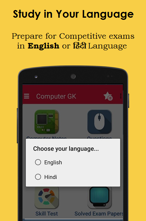 Computer Awareness, Computer GK App with Short Computer Notes, Multiple Choice Questions (MCQs), Old Exam Papers in English and Hindi for competitive examinations.