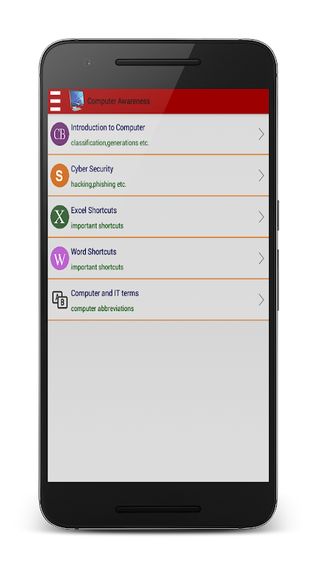 所有基本的計算機應用意識的計算機知識的問題(目標型選擇題)旨在從基礎到高級的概念覆蓋,因此,任何考生可以得到最大的效益出來。我們希望,電腦認知應用將成為候選人/學生/受訪者真的很有幫助。該應用程序支持美國和英國的英文字體。