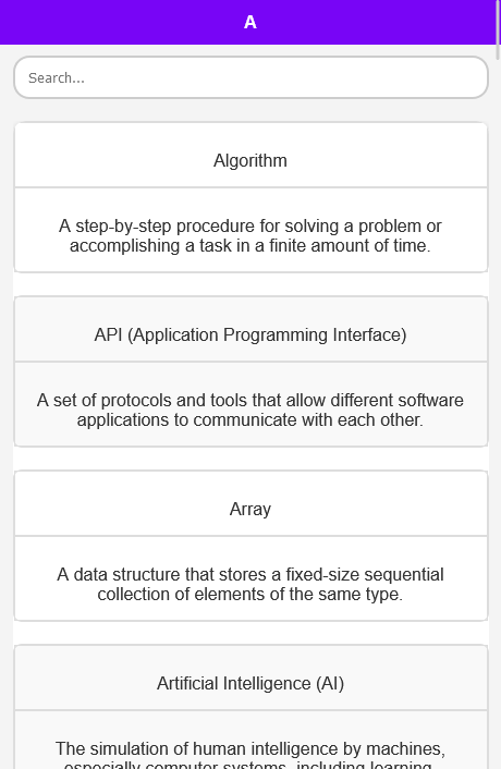 搜尋功能:這個電腦科學字典應用程式具有搜尋功能。使用我們強大的搜尋功能找到您需要的確切術語或概念。無論您是在尋找特定定義還是探索新主題,我們的搜尋工具都能提供快速、準確的結果。