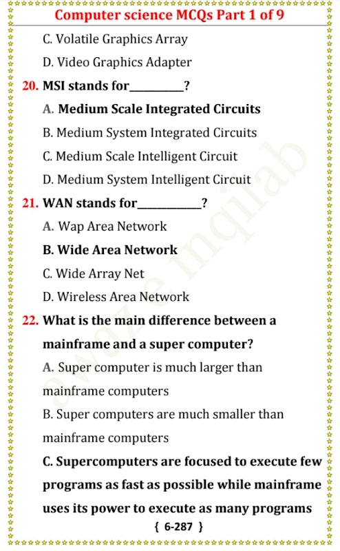 計算機科學,計算機和計算的研究,包括其理論和算法基礎,硬件和軟件及其在處理信息中的用途。計算機科學學科包括算法和數據結構,計算機和網絡設計,數據和信息處理建模以及人工智能的研究。計算機科學從數學和工程學中汲取了一些基礎,因此結合了諸如排隊論,概率和統計以及電子電路設計等領域的技術。計算機科學在新算法,信息結構和計算機體系結構的概念化,設計,測量和改進過程中也大量使用假設測試和實驗。計算機科學MCQ(第1,2,3部分)900+ MCQ for Test(NTS) ,CSS,PMS等)準備。計算機基礎MCQ,計算機MCQ,MS Office,