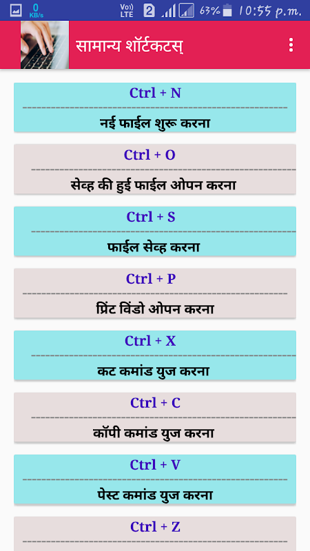 The Aim of this Computer - All Shortcut Keys App is to education app for Motivate Computer using Students and Professionals across the World into Learning All Important Concepts of Shortcut Keys. it is basic shortcut keys. its available two different Categories computer shortcut keys in hindi and English. This file is a virus free Computer Shortcut Keys and is the property and Trademark from the developer Aryan Raj.