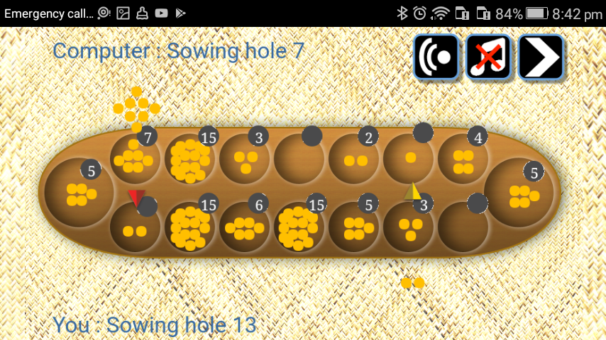 玩家可以從玩家身邊的任何洞中挑選種子,攜帶種子,同時將它們逐個放入洞(或“村莊”),包括進入玩家自己的“家”但不進入對手的家。如果最後的種子最終進入包含種子的洞中,則玩家可以從中拾取所有種子並繼續遊戲,否則,玩家將停止並等待對手完成。