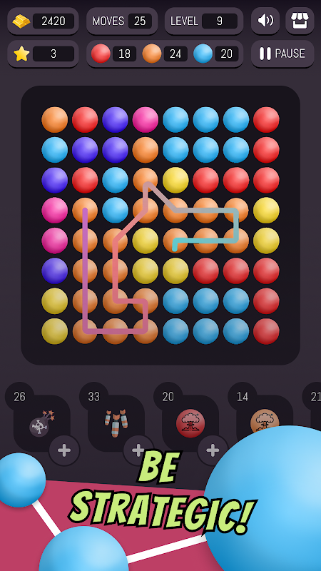 只需滑動一個點、兩個點、三個點以及更多相同顏色的點即可將它們連接起來並清除棋盤。鏈條越長,效果越強,囤積的星星就越多!