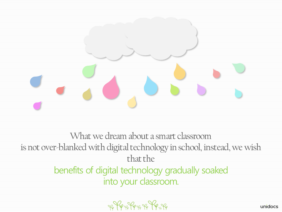 What we dream about a smart classroom is not over-blanked with digital technology in school, instead, we wish that the benefits of digital technology gradually soaked into your classroom.