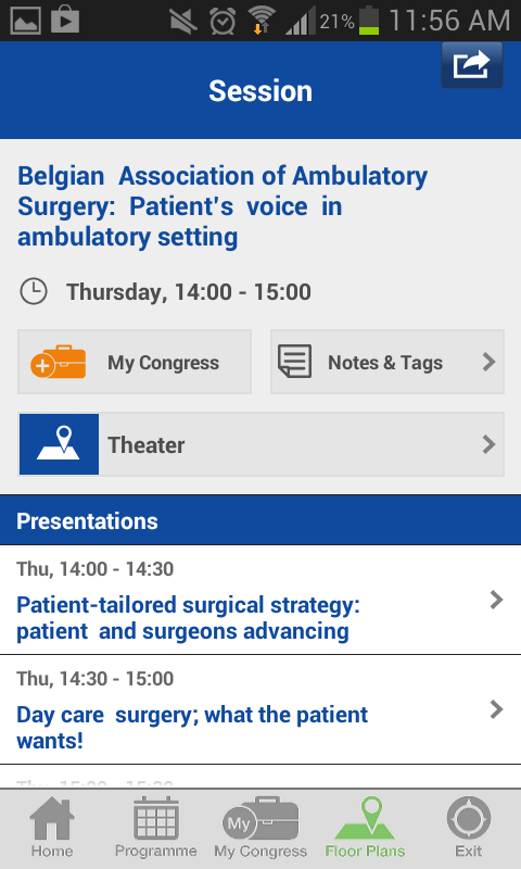You can browse the program by day or by topic, and even by author, speaker or session chair. Marking presentations and sessions you would like to attend adds them to your personal program, which is a great way to be efficient at the conference and spend time talking to people and listening to talks rather than paging through the big printed conference program. The ConPass app is also a great way to collect everything you like, such as people you meet, exhibitors you would like to see, your favorite topics and the notes and tags you have added to presentations and sessions. You can share them with your colleagues and the outside world through Twitter, Facebook and e-mail. Additionally, the interactive floor plan always tells you exactly where you need to go next.