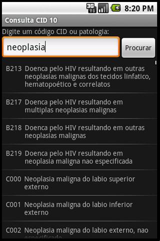 Aplicativo para consulta a todas as subcategorias da Classificação Estatística Internacional de Doenças e Problemas Relacionados à Saúde (CID-10) da OMS. A pesquisa pode ser feita pelo código CID (ex: C50.1) ou pela descrição da patologia (ex: neoplasia de mama).
