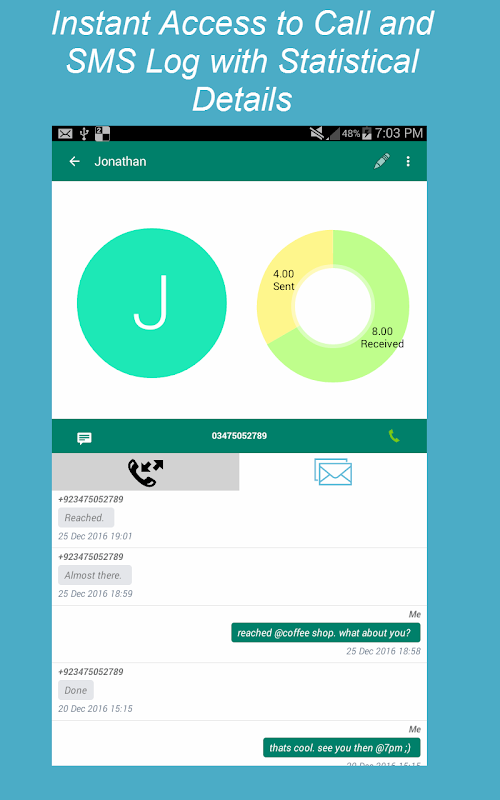 Select any contact and get complete SMS chat and Call log of contact. This features is more user-full with detailed charts.