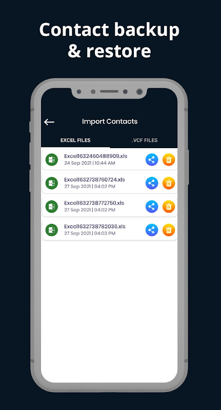 You can backup all your contacts with a single touch and store it as a .vcard file in your phone. All contacts can be easily restored at any time simply by opening the .vcard file or by using local recovery by selecting "Restore" in the Contact Backup or Export Import Excel Contact app.