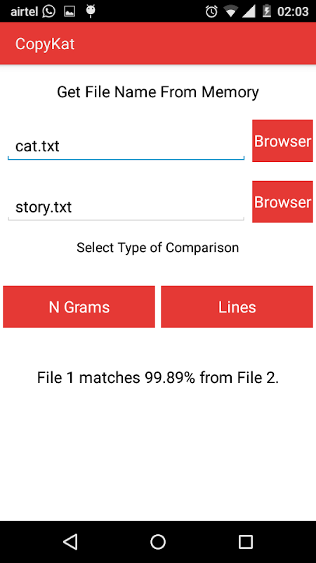 The application helps to detect the similarity between two text files containing the work done by students or any one The user just need to choose two files present in the internal memory which he needs to compare using comparison by parts(n grams) or line by line.