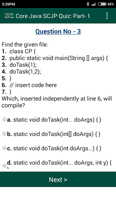 Test Core Java skills to prepare for job interviews and SCJP examination. We cover here Inheritance, Polymorphism, Concurrency and Exception Handling. Every quiz contains 10 questions and every question contains 4 answers, out of which only one answer is correct. At the end of quiz, we will get score as well as a button to check solution. There is no time limit to complete the quiz.