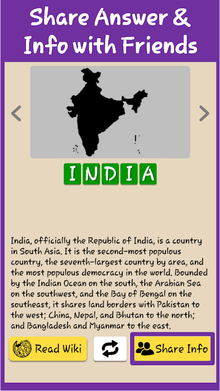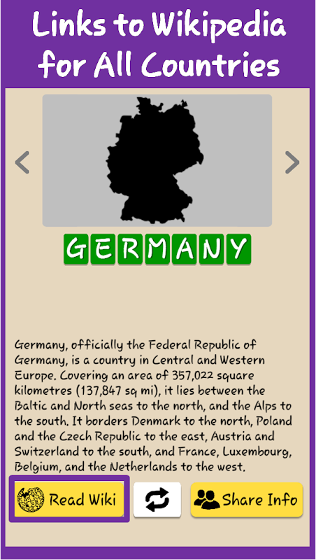 Guess the Country names by seeing their Maps and Flags. Have Fun and Enjoy the Quiz Game.