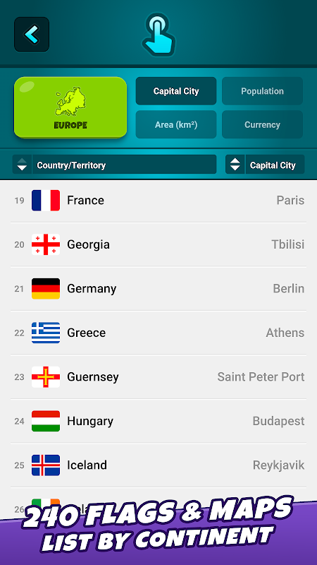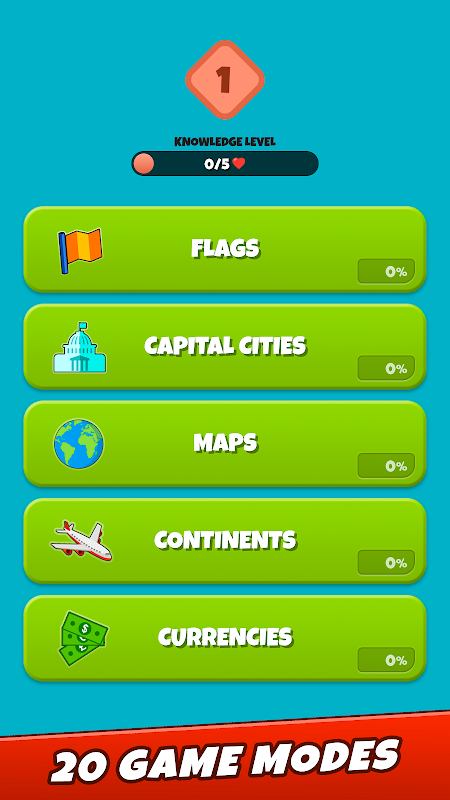 每種遊戲類型都有 15 個關卡要完成,隨著您的前進,這款遊戲會變得越來越難。每個級別都有 20 個國旗、首都城市、地圖、大洲或貨幣,您只有 20 秒的時間來匹配每個問題的國旗或國家/州。您還將在猜測的同時了解人口和地區等詳細信息,使這款遊戲成為您邊玩邊學習的絕佳方式。