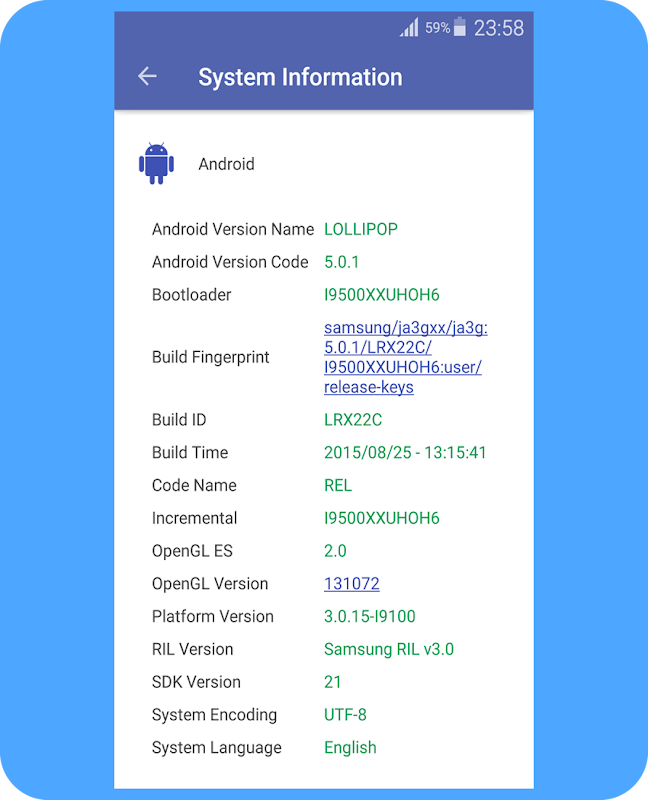 <> Device : Model, Manufacturer, Chipset, Build Number and Android OS version.