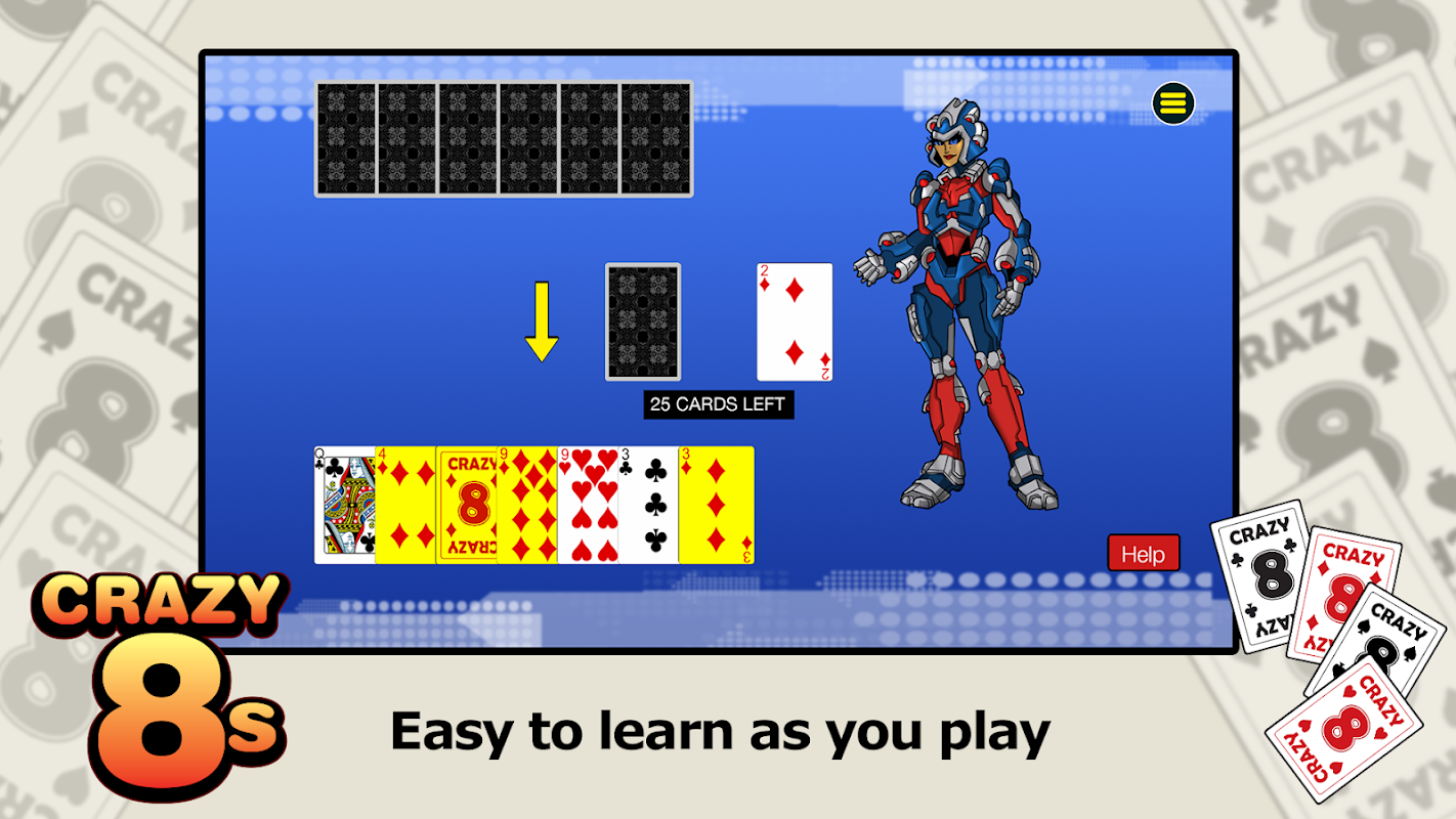 這是適合所有年齡段的經典Crazy Eights紙牌遊戲的單人版本,您可以在這裡與電腦對戰。這個版本的Crazy Eights在玩遊戲時很容易學習。雖然Crazy Eights有不同且複雜的變化,但這個應用程序使用每回合限制一張牌的簡單規則。如果您需要,可在遊戲過程中提供幫助。