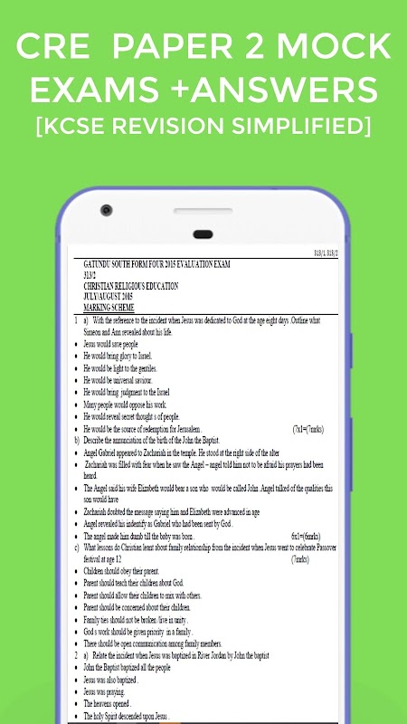 參加50多種CRE MOCK考試,並涵蓋紙質CRE考試及其設置方式,以反映學生和老師在最終的KCSE考試中的期望,因為本文的一分題是反映kcse的標準