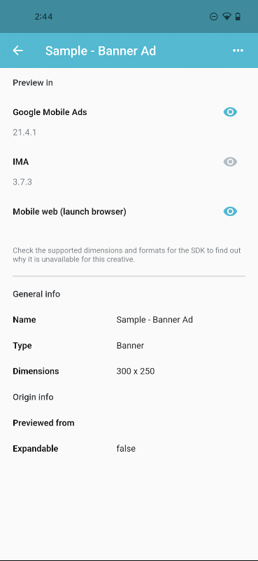 掃描 Google Marketing Platform 產品中的 QR 碼以在您的設備上預覽廣告,或手動添加創意網址。使用支持的移動廣告 SDK 在您的設備上或在任何移動瀏覽器中進行測試,並在應用程序的控制台中查看報告指標。