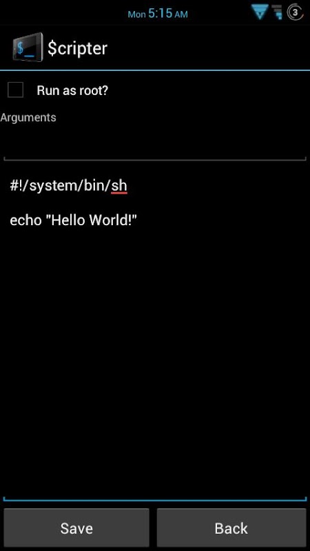 This app allows you to write and run shell scripts. It has run as root capabilities if your android device is rooted. Easily import scripts from multiple directories and create new scripts in specified directories.
