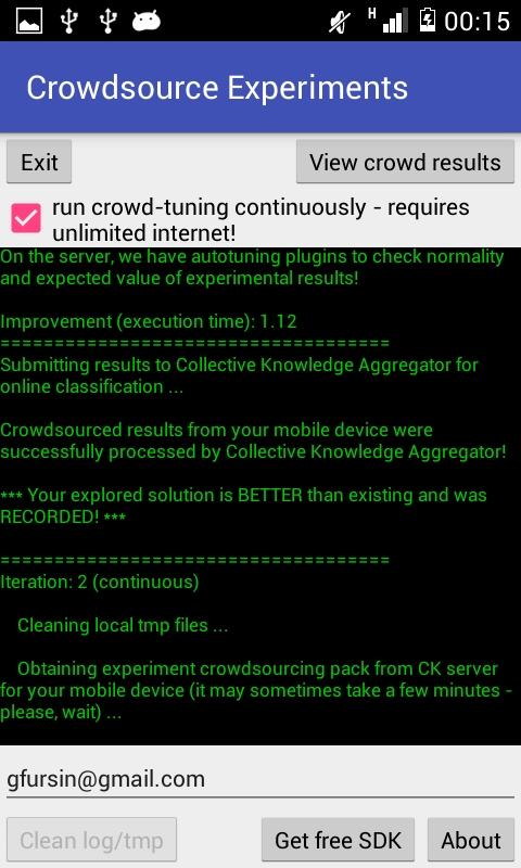 隨著非營利cTuning基金會的幫助下,我們開發了這個開源的集體知識技術(CK),以讓社會共享的工作負載,數據集,工具和實驗工作流程中通過GitHub上或到位桶開放CK格式,跨越眾包實驗由志願者提供了大量的設備,分類動態(主動學習)解決方案,適用於預測分析,交流知識和繁殖的結果。我們目前的共享實驗場景,包括GCC和LLVM編譯器標誌調整,我們計劃增加自動的OpenCL / CUDA優化,可擴展性測試,編譯器錯誤檢測和數值穩定性分析(見基於CK-交互式報表:http://cknowledge.org/交互式報告)!此應用程序只需查詢任何可用的公共CK服務器,獲得實驗組為您的設備(如使用不同的優化共享的基準數的二進制文件),用一些隨機數據集運行時,它在移動設備上發送數據回CK服務器成為採用主動學習和預測分析處理。