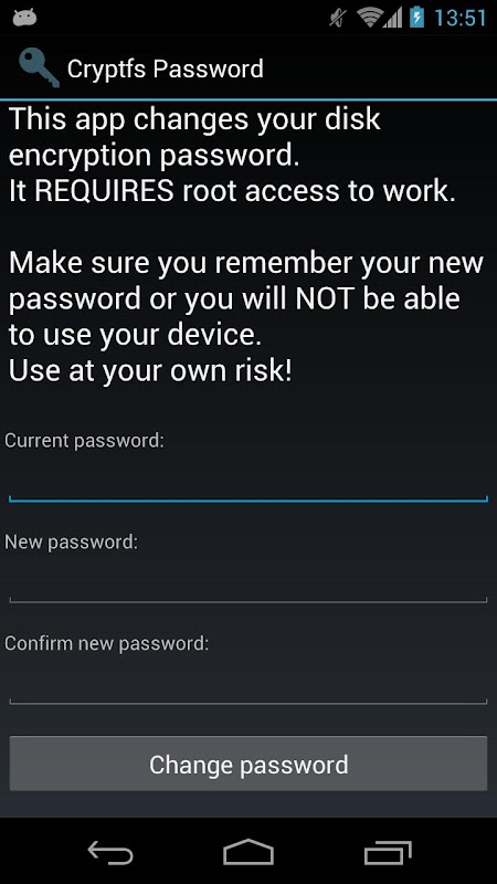 Android的3.0(蜂巢)推出的磁盤加密,它已經適用於所有後續版本。它加密與由用戶選擇的密碼保護的密鑰數據分區,並且需要以引導設備輸入密碼。然而,Android使用設備的解鎖密碼或PIN的設備加密密碼,並且不允許您分別更改。這有效地迫使你用一個簡單的密碼,因為你在每次解鎖設備,通常數十次一天的時間來輸入。這個工具允許您更改加密密碼更安全的,不影響屏幕解鎖密碼/ PIN。要更改設備的加密密碼簡單: