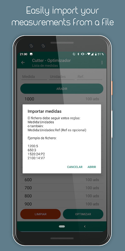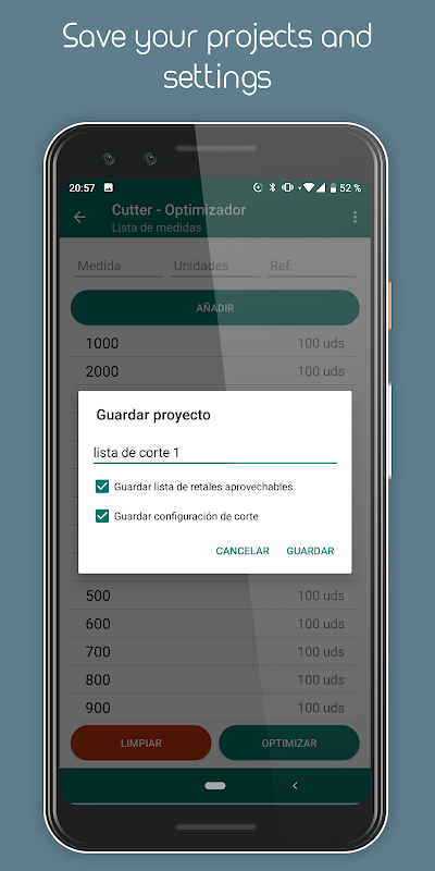 * 個人化您的切割:保存帶有名稱的測量列表,輕鬆檢索它們,或匯入您自己的檔案。