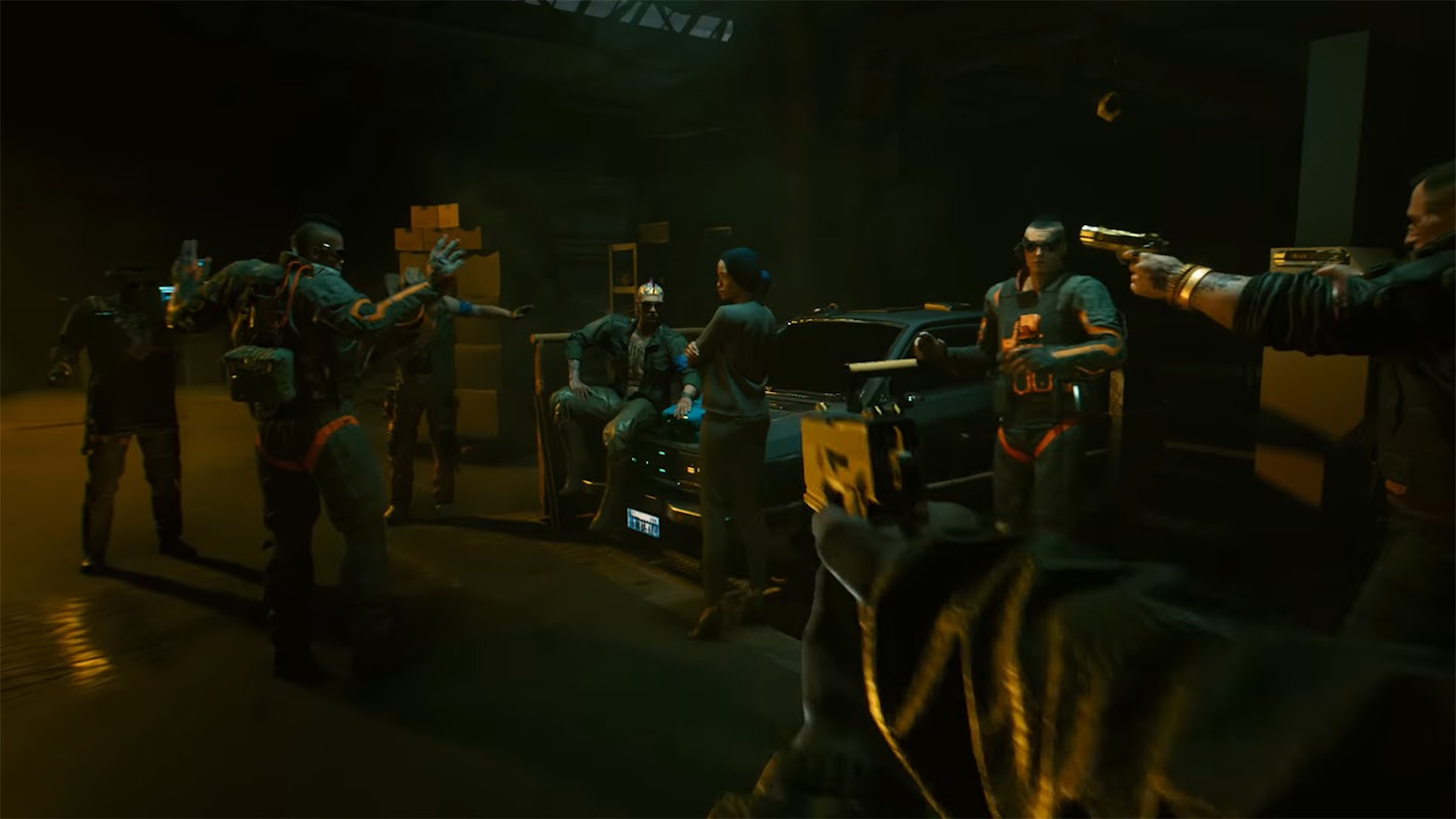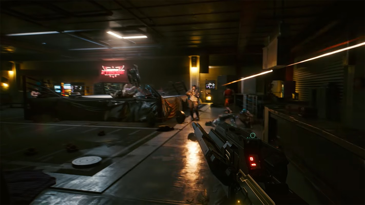 Cyberpunk 2077 is played in a first-person perspective as V, a mercenary whose voice, face, hairstyles, body type and modifications, background, and clothing are customisable.