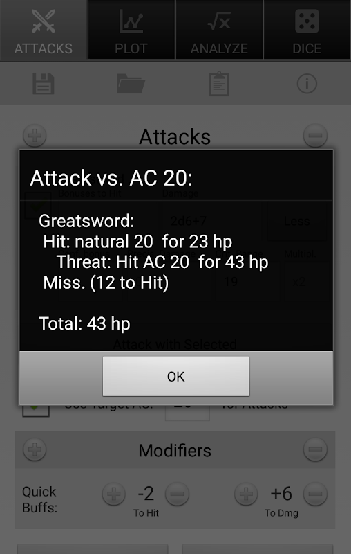 d20 Attack Calc Lite是一款功能強大的戰鬥計算器,優化工具和骰子滾輪,適用於D20 RPG系統,如Pathfinder RPG或D&D 3.0 / 3.5 / 5th版。使用此程序為複雜的攻擊例程擲骰子,並從可視化圖形和骰子滾動統計信息中評估角色構建。