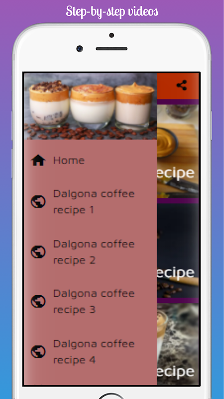 Dalguna Coffee 2021 app contains videos of Dalgona coffee preparation recipes with steps for one or three people