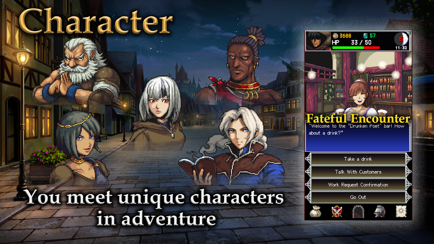 這一次,冒險從某個小鎮開始。去酒吧,你會遇到各種各樣的人,所以記得在交談的時候收集資訊。根據對話選項,它可以是友好的,也可以是敵對的。