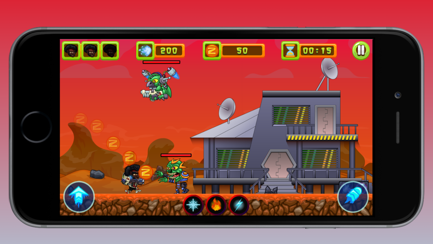 在這個遊戲中,你必須點擊跳躍和射擊按鈕來擊中和躲避進來的怪物,這樣你就可以通過收集硬幣來得分並繼續你的旅程!