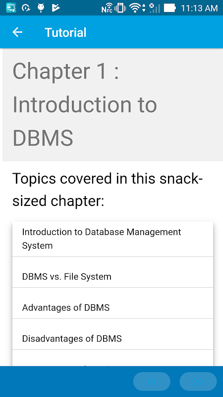 You have limited access to the content provided. For full access to the content, please login and purchase this application. This app provides a quick summary of essential concepts in Database Management System by following snack sized chapters: