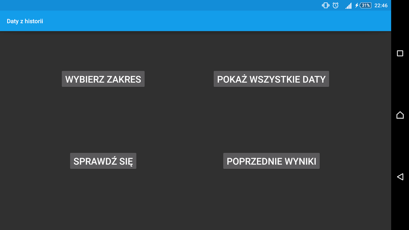 Prosta aplikacja do nauki dat z historii. Zawiera ponad 60 dat, które są podzielone na 3 grupy według trzech klas.