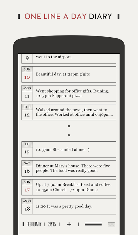 Daygram是一個簡單的日記應用提供與電子墨水的迷人感用戶。寫下與Daygram你每天的生活事件,寫日記不再是負擔。你會習慣寫日記,享受書寫!讓我們回頭看看你今天所做的一切,把它寫下來,並承諾自己一個美好的明天。 Daygram具有用戶友好的和直觀的界面。忘掉在市場上令人費解的和複雜的日記應用!符合Daygram和升級你的生活方式。