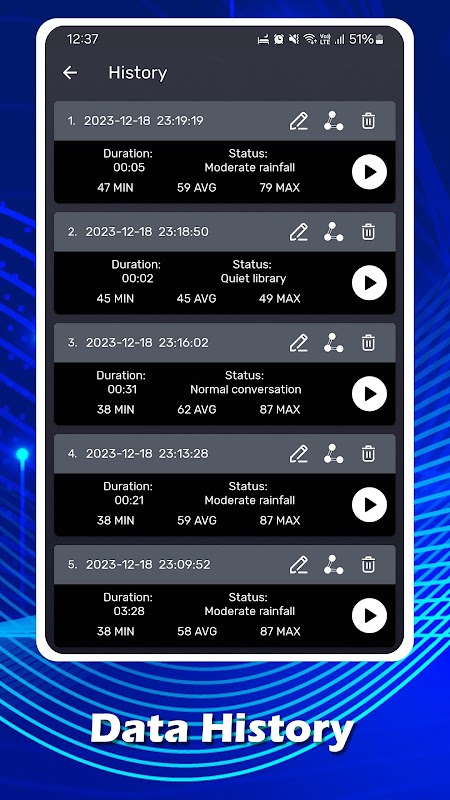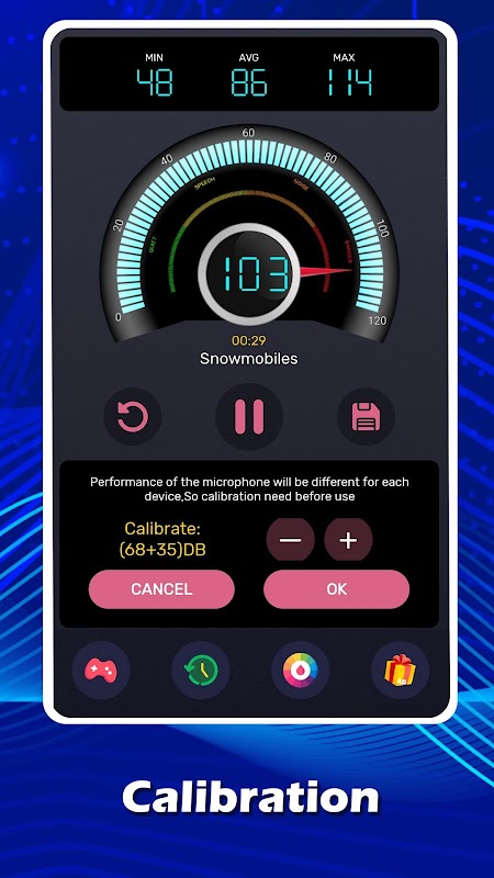 - 精確的分貝測量:獲得以分貝 (dB) 為單位的環境聲級的準確讀數,並即時顯示在清晰直觀的介面上。