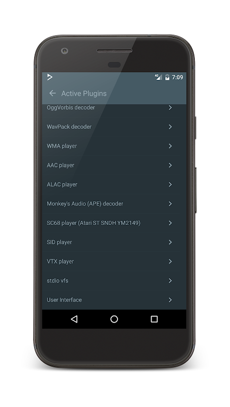 解碼器包括:AAC,ALAC,APE,SNDH,SID,VTX,AY,GBS,GYM,HES,KSS,NSF,NSFE,SAP,SFM,SPC,VGM,VGZ。