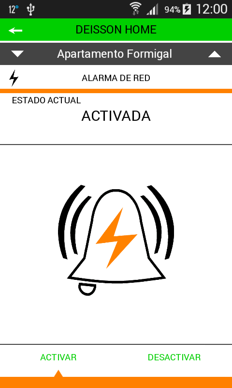 Si se produce una alarma (intrusión, incendios, fallo de red), en la pantalla principal de la app aparece el icono correspondiente en rojo. Para cancelar los avisos se debe entrar en la alarma correspondiente, se desactiva y se envía al dispositivo. Tras verificar la causa de la alarma, se puede volver a activar.