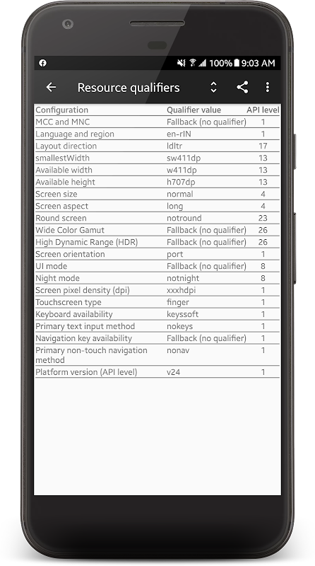 Using this app you can see which resource qualifiers that are being used, which system features that are available, and see details about the display and its sizes.