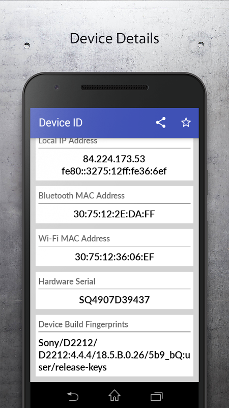 輕量級 Android 應用程式將幫助您獲取有關 Android 裝置的重要資訊。就像 Android 裝置 ID、本機 IP 位址一樣,您可以複製以供進一步使用,也可以與其他人共用以供使用。