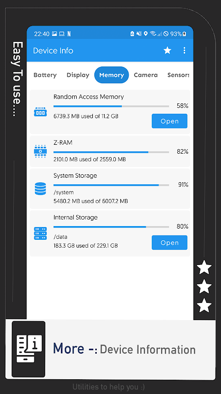 Our app provides the most detail of CPU information, Storage information like (internal and external storage), Device information, System information, Battery information, Display information, Memory information, Camera information, Sensors information available, Network information, SIM information, show all apps sus as user-installed apps and system apps, Test hardware (check is all hardware is work).