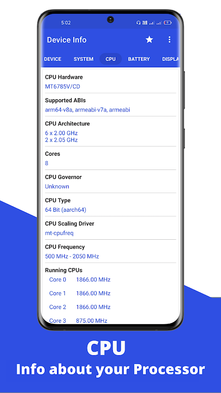 裝置資訊是一款用戶友好的Android應用程序,旨在提供有關您的行動裝置的完整而詳細的信息,並具有最佳的用戶介面。該應用程式不僅對普通用戶有益,而且對開發核心或 Android 應用程式的開發人員也有益。 裝置資訊包含眾多功能,可提供有關Android 裝置的軟體和硬體方面的廣泛見解,包括CPU、RAM、作業系統、感測器、儲存、電池、SIM 卡、藍牙、已安裝的應用程式、系統應用程式、顯示、相機、散熱、編解碼器、輸入、安裝的儲存和 CPU 狀態時間。