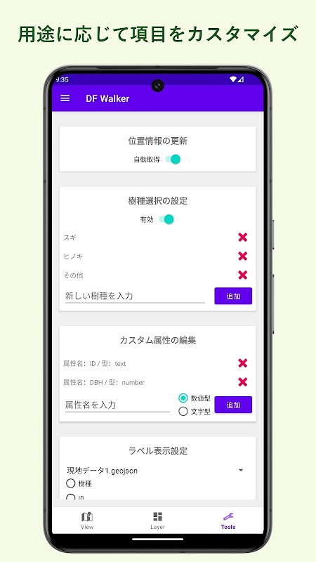 DF Walker 是一款智慧型手機/平板電腦應用程序,旨在用於森林實地調查。您可以顯示覆蓋在地圖上的森林正射影像。我們透過參考GPS取得的位置資訊來支援現場樹木辨識工作。多邊形建立功能可讓您記錄樹木資訊和位置信息,並且可以使用GIS軟體檢查建立的資料(GeoJSON格式)。