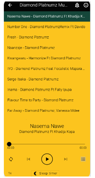 有關信息,此應用程序包含歌曲 Diamond Platnumz 和其他在線歌手。根據 Google Play 不允許上傳大內存容量應用程序的政策,我們被迫限制可以在線收聽的歌曲數量。