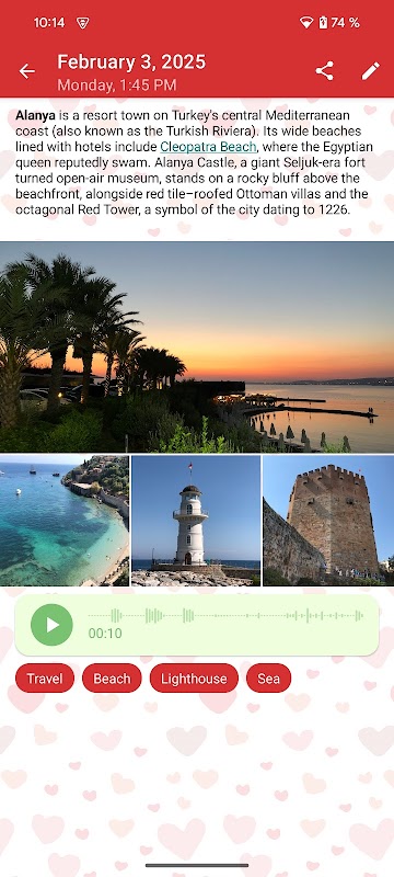📸 用照片和影片添加筆記可以讓你的日記更加直覺、情感豐富和詳細。而語音筆記有助於更好地捕捉瞬間,傳達簡單文字難以形容的氛圍和情緒。將來,這樣的筆記將成為你想回顧的生動回憶。