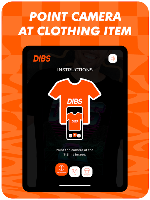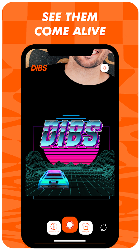 Experience augmented reality graphics like you've never seen them before! DIBS introduces our collection of wearable Augmented Reality t-shirts. An experience unlike any seen before, where graphics actually come to life! See for yourself, it's easy! First, open the DIBS app and the home screen will appear. Second, point your phone's camera at the graphic or garment that you would like to see come to life. Third, the graphic and soundtrack will now activate and begin playing on your phone screen. Move the phone around to see the Augmented Reality visual in a more 3D perspective. Tap the screen to unlock more features of the AR graphic. Make sure to screen shot or screen record and share it with your friends via our shareable social media links built into the app!