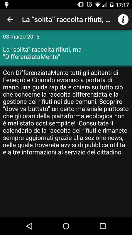 Con DifferenziataMente avrai a portata di mano una guida rapida e chiara su tutto ciò che concerne la raccolta differenziata e la gestione dei rifiuti nei due comuni di Fenegrò e Cirimido. Scoprire “dove va buttato” un certo materiale piuttosto che gli orari della piattaforma ecologica non è mai stato così semplice! Consultate il calendario della raccolta dei rifiuti e rimanete sempre aggiornati grazie alla sezione news, nella quale troverete avvisi di pubblica utilità e altre informazioni al servizio del cittadino.
